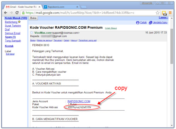 2. Buka email dari ViooMax, temukan kode vouchernya lalu copy/salin